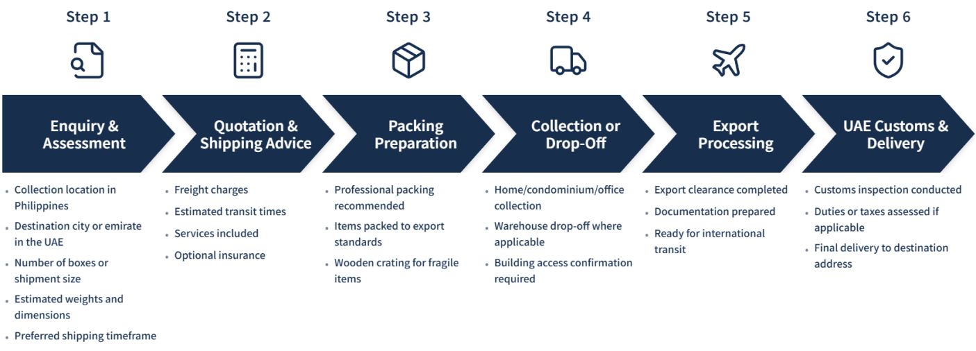Shipping personal effects from the Philippines to the United Arab Emirates (UAE) requires careful planning, accurate documentation, and compliance with UAE customs regulations. Whether you are relocating for work, returning to the Gulf region, or sending personal belongings ahead, preparing your shipment correctly is essential to avoid customs delays, inspections, or additional charges.